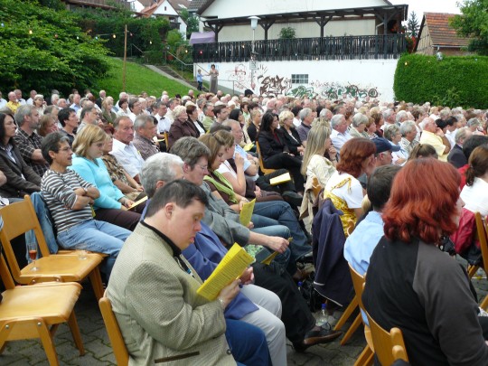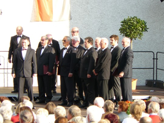 Zwölf Stunden zuvor waren die Mienen der Sänger beider Männerchöre eher düster, denn der Himmel hatte entgegen der guten Wetterprognosen seine Schleusen geöffnet und ließ es kontinuierlich regnen. So mussten die schon auf dem Rathaus-Parkplatz aufgestellten Stühle mit Planen beschützt werden. Erleichterung machte sich in den Gesichtern der Frohsinn- und Eintracht-Aktiven breit, als sich am späten Nachmittag die Regenwolken verzogen. Als dann eine Viertelstunde vor Konzertbeginn noch zahlreiche Bänke aufgeschlagen werden mussten, weil der Andrang die angesichts der Witterungsbedingungen zurückgeschraubten Erwartungen übertraf, löste sich die Anspannung und machte Platz für die Vorfreude auf das mit Spannung erwartete Freiluft-Konzertereignis.